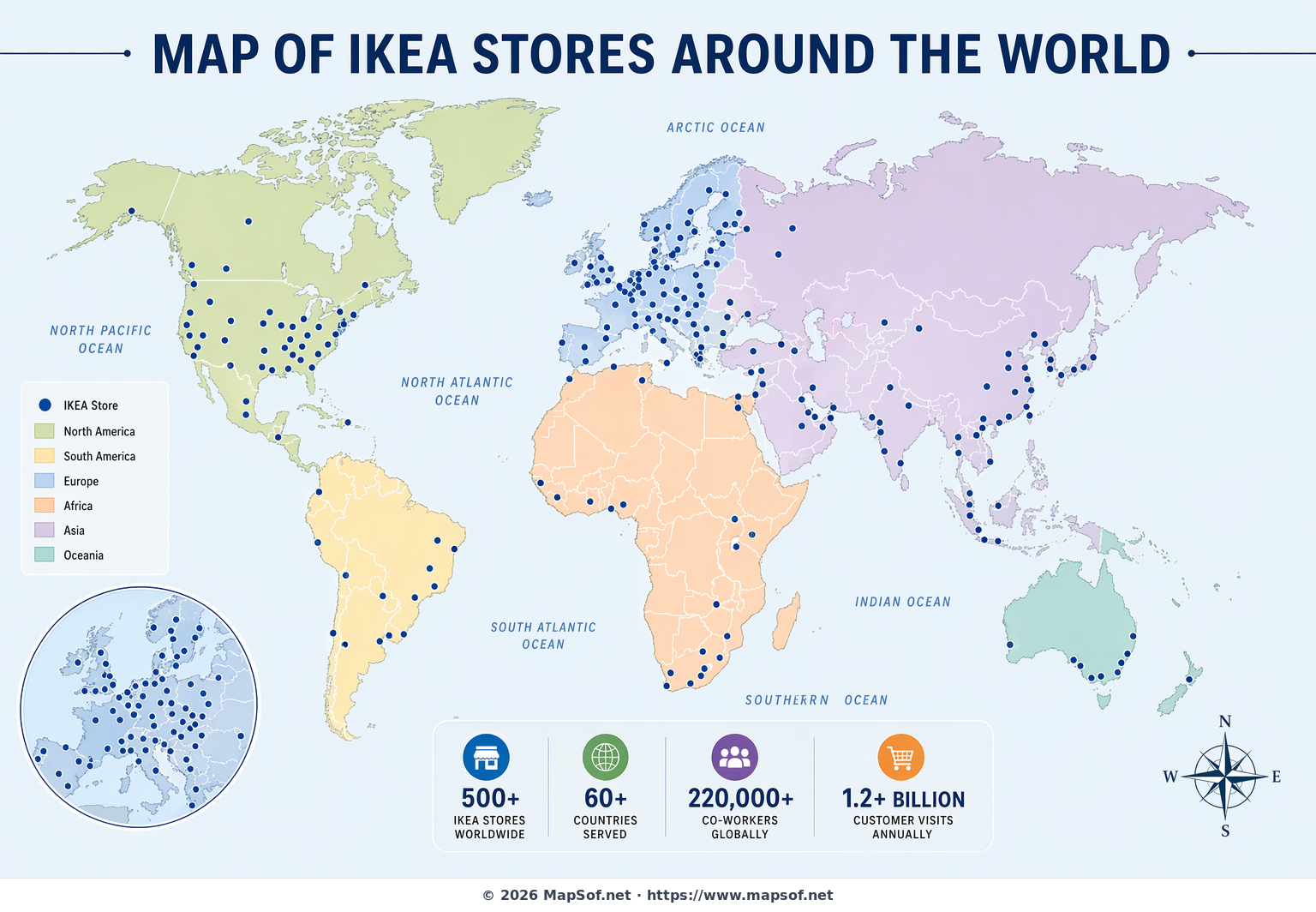 This professionally designed map visualizes the global footprint of IKEA store locations, highlighting countries and major metropolitan areas where the retailer operates. A harmonious color palette differentiates key regions—Europe, North America, Asia-Pacific, the Middle East, and Latin America—while clear labels and sharp boundaries ensure excellent legibility. Proportional markers convey relative store concentrations at a glance, making it easy to identify dense clusters and emerging markets.